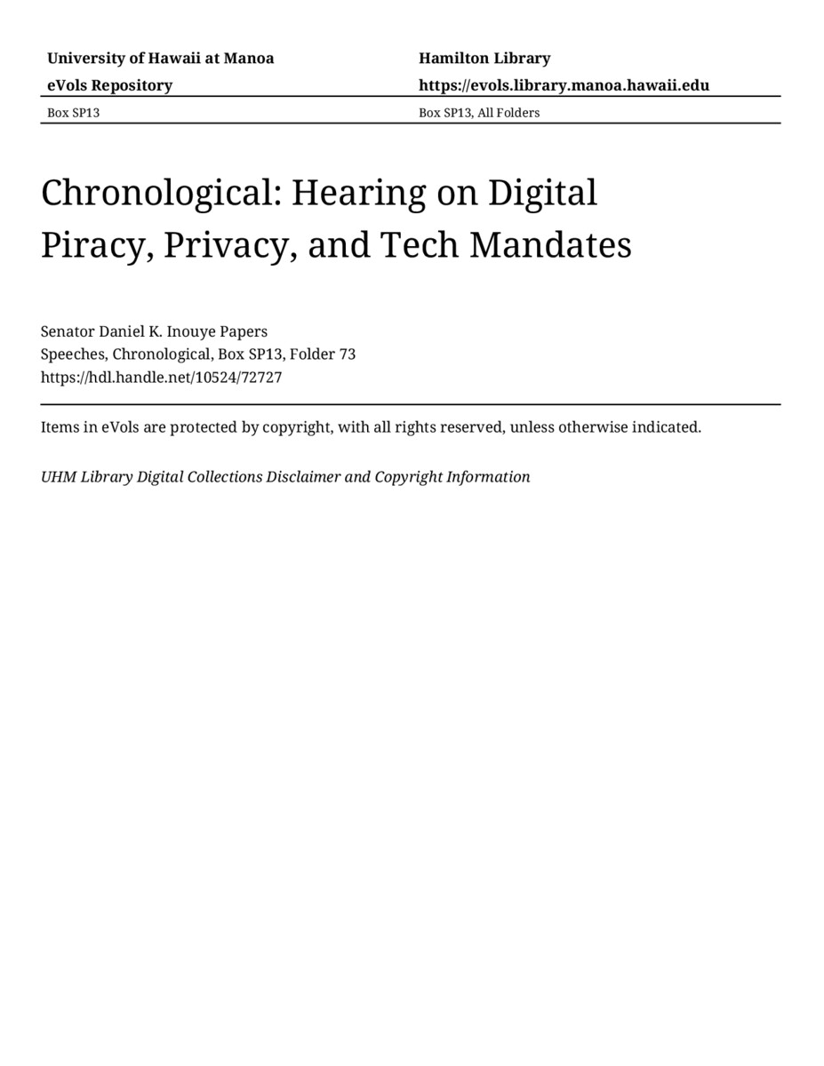 Hearing on Digital Piracy, Privacy, and Tech Mandates, September 17, 2003, MANUSCRIPT-HCPC00011, Speeches, Chronological, Box SP13, Folder 73, Senator Daniel K. Inouye Papers, Hawaiʻi Congressional Papers Collection, University of Hawaiʻi at Mānoa Library, Honolulu, HI. https://congressarchives.org/catalog/10524_72727 (accessed March 20, 2026).