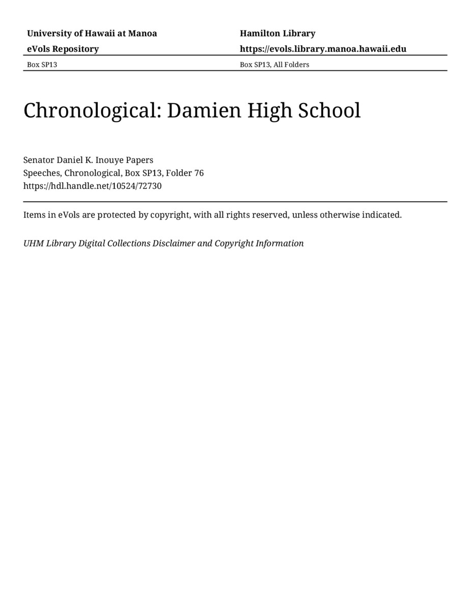Damien High School, March 16, 2004, MANUSCRIPT-HCPC00011, Speeches, Chronological, Box SP13, Folder 76, Senator Daniel K. Inouye Papers, Hawaiʻi Congressional Papers Collection, University of Hawaiʻi at Mānoa Library, Honolulu, HI. https://congressarchives.org/catalog/10524_72730 (accessed March 21, 2026).