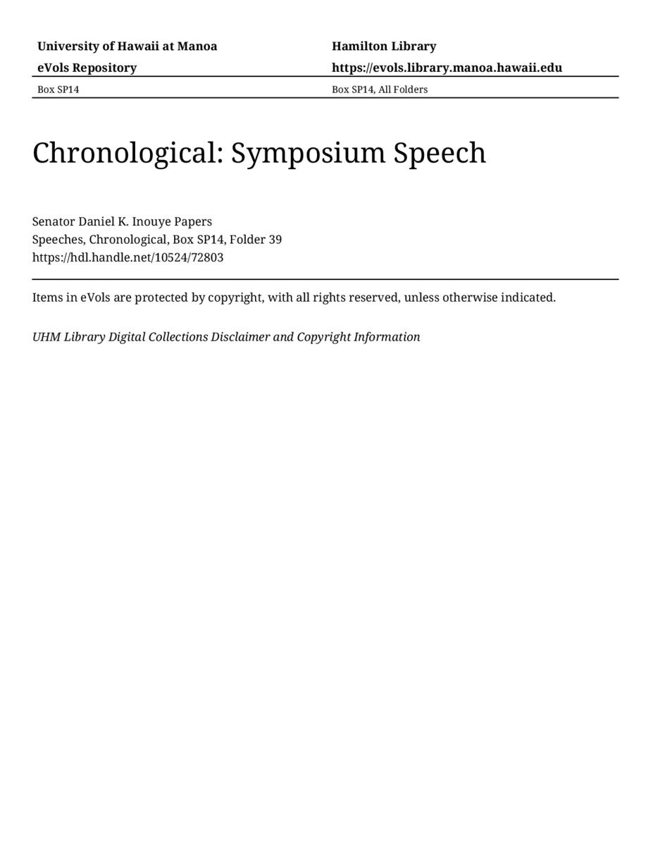Symposium Speech, May 25, 2005, MANUSCRIPT-HCPC00011, Speeches, Chronological, Box SP14, Folder 39, Senator Daniel K. Inouye Papers, Hawaiʻi Congressional Papers Collection, University of Hawaiʻi at Mānoa Library, Honolulu, HI. https://congressarchives.org/catalog/10524_72803 (accessed March 19, 2026).