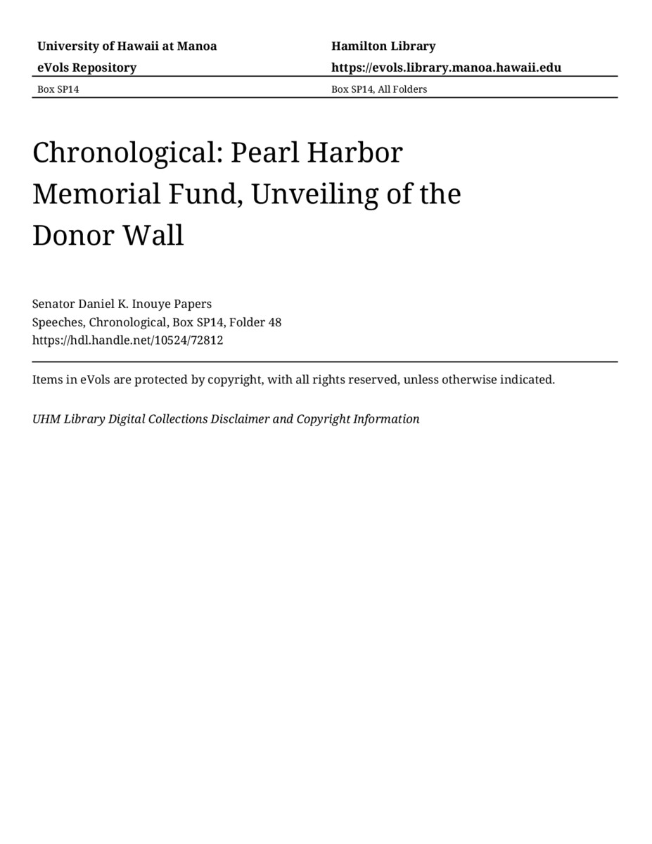 Pearl Harbor Memorial Fund, Unveiling of the Donor Wall, December 6, 2005, MANUSCRIPT-HCPC00011, Speeches, Chronological, Box SP14, Folder 48, Senator Daniel K. Inouye Papers, Hawaiʻi Congressional Papers Collection, University of Hawaiʻi at Mānoa Library, Honolulu, HI. https://congressarchives.org/catalog/10524_72812 (accessed March 20, 2026).