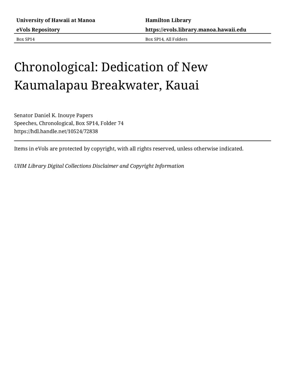 Dedication of New Kaumalapau Breakwater, Kauai, July 7, 2007, MANUSCRIPT-HCPC00011, Speeches, Chronological, Box SP14, Folder 74, Senator Daniel K. Inouye Papers, Hawaiʻi Congressional Papers Collection, University of Hawaiʻi at Mānoa Library, Honolulu, HI. https://congressarchives.org/catalog/10524_72838 (accessed March 20, 2026).