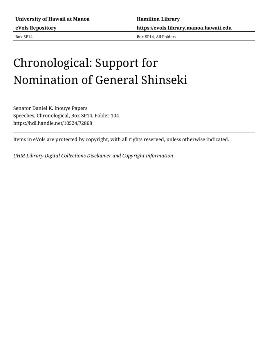 Support for Nomination of General Shinseki, January 14, 2009, MANUSCRIPT-HCPC00011, Speeches, Chronological, Box SP14, Folder 104, Senator Daniel K. Inouye Papers, Hawaiʻi Congressional Papers Collection, University of Hawaiʻi at Mānoa Library, Honolulu, HI. https://congressarchives.org/catalog/10524_72868 (accessed March 20, 2026).
