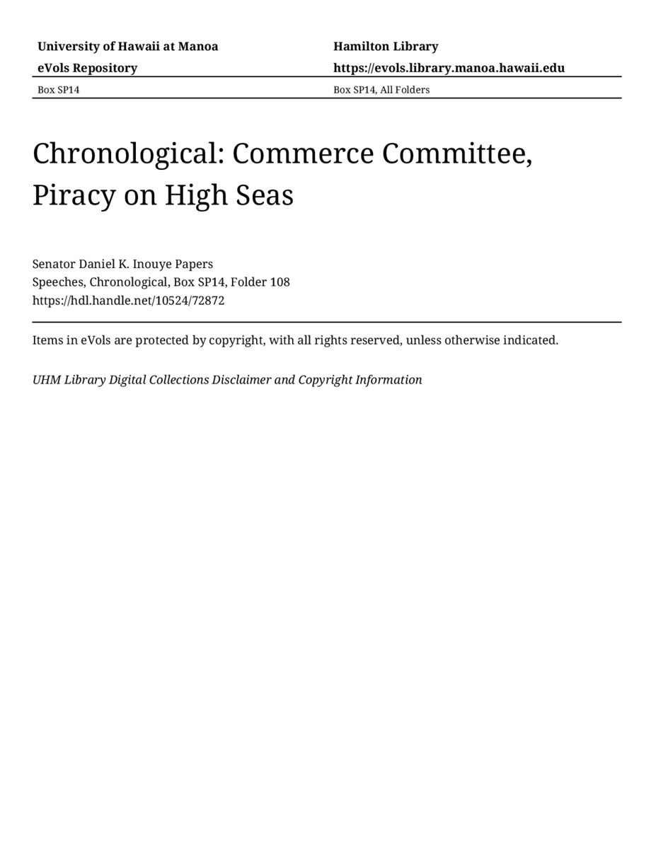 Commerce Committee, Piracy on High Seas, May 5, 2009, MANUSCRIPT-HCPC00011, Speeches, Chronological, Box SP14, Folder 108, Senator Daniel K. Inouye Papers, Hawaiʻi Congressional Papers Collection, University of Hawaiʻi at Mānoa Library, Honolulu, HI. https://congressarchives.org/catalog/10524_72872 (accessed March 20, 2026).