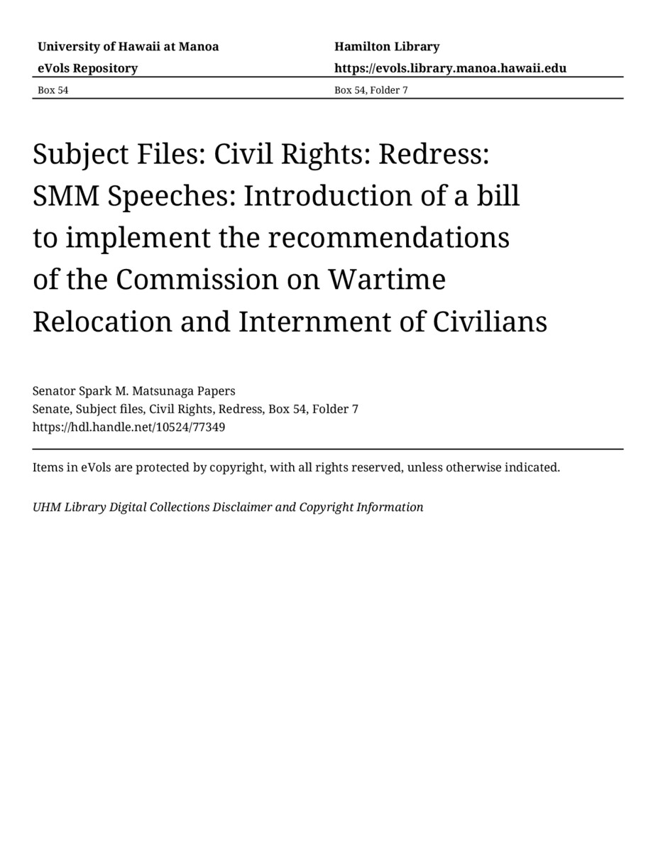 Introduction of a bill to implement the recommendations of the Commission on Wartime Relocation and Internment of Civilians, April 10, 1987, MANUSCRIPT-HCPC00001, Senate, Subject files, Civil Rights, Redress, Box 54, Folder 7, Senator Spark M. Matsunaga Papers, Hawaiʻi Congressional Papers Collection, University of Hawaiʻi at Mānoa Library, Honolulu, HI. https://congressarchives.org/catalog/10524_77349 (accessed March 20, 2026).