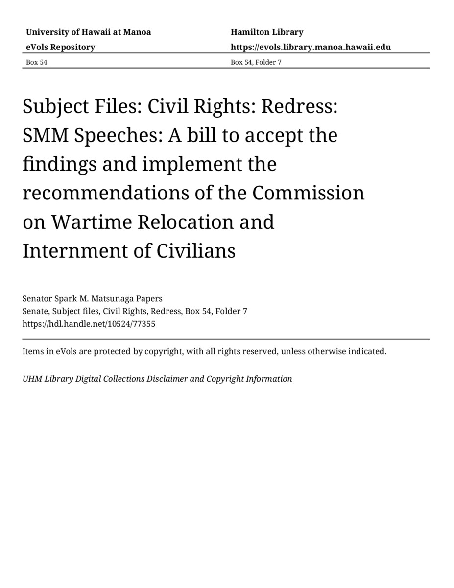 A bill to accept the findings and implement the recommendations of the Commission on Wartime Relocation and Internment of Civilians, August 16, 1984, MANUSCRIPT-HCPC00001, Senate, Subject files, Civil Rights, Redress, Box 54, Folder 7, Senator Spark M. Matsunaga Papers, Hawaiʻi Congressional Papers Collection, University of Hawaiʻi at Mānoa Library, Honolulu, HI. https://congressarchives.org/catalog/10524_77355 (accessed March 21, 2026).