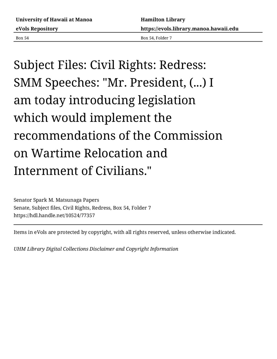 "Mr. President, (...) I am today introducing legislation which would implement the recommendations of the Commission on Wartime Relocation and Internment of Civilians.", November 17, 1983, MANUSCRIPT-HCPC00001, Senate, Subject files, Civil Rights, Redress, Box 54, Folder 7, Senator Spark M. Matsunaga Papers, Hawaiʻi Congressional Papers Collection, University of Hawaiʻi at Mānoa Library, Honolulu, HI. https://congressarchives.org/catalog/10524_77357 (accessed March 21, 2026).