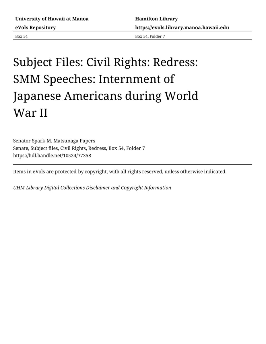 Internment of Japanese Americans during World War II, May 22, 1983, MANUSCRIPT-HCPC00001, Senate, Subject files, Civil Rights, Redress, Box 54, Folder 7, Senator Spark M. Matsunaga Papers, Hawaiʻi Congressional Papers Collection, University of Hawaiʻi at Mānoa Library, Honolulu, HI. https://congressarchives.org/catalog/10524_77358 (accessed March 21, 2026).