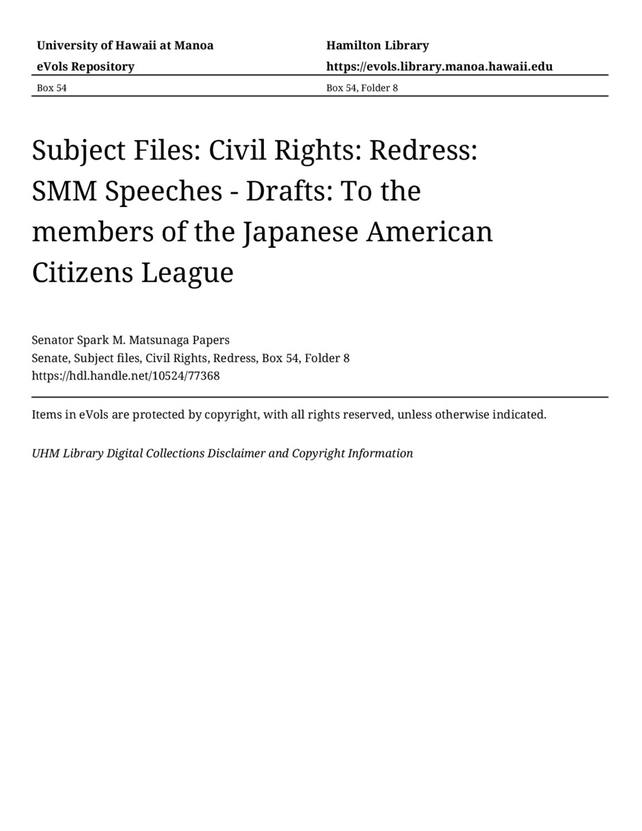 To the members of the Japanese American Citizens League, August 13, 1984, MANUSCRIPT-HCPC00001, Senate, Subject files, Civil Rights, Redress, Box 54, Folder 8, Senator Spark M. Matsunaga Papers, Hawaiʻi Congressional Papers Collection, University of Hawaiʻi at Mānoa Library, Honolulu, HI. https://congressarchives.org/catalog/10524_77368 (accessed March 21, 2026).