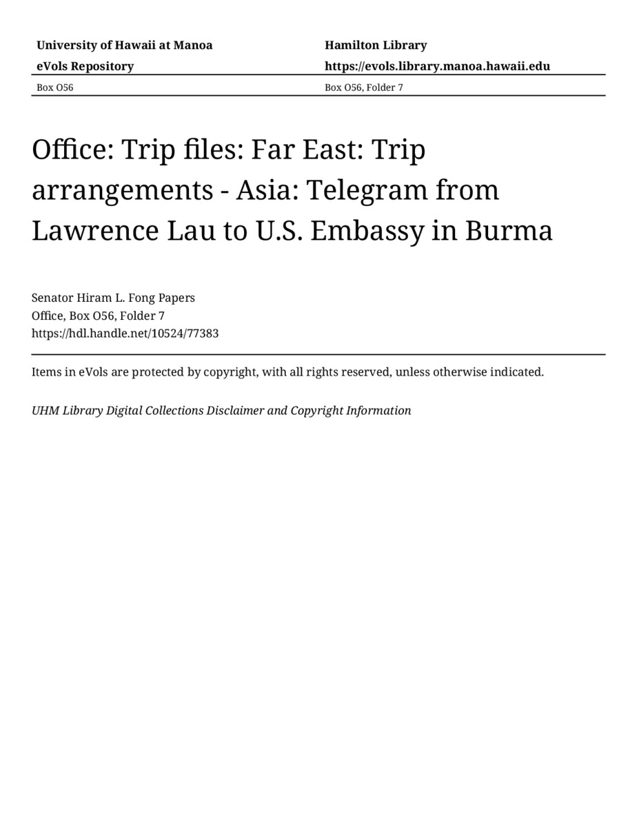 - Fong, Hiram, 1906-2004, United States. Embassy (Burma)