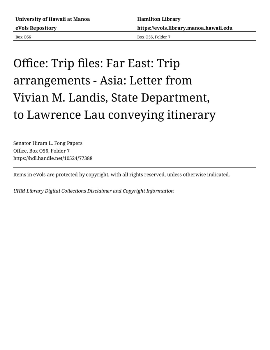 - Letter from Vivian M. Landis, State Department, to Lawrence Lau conveying itinerary