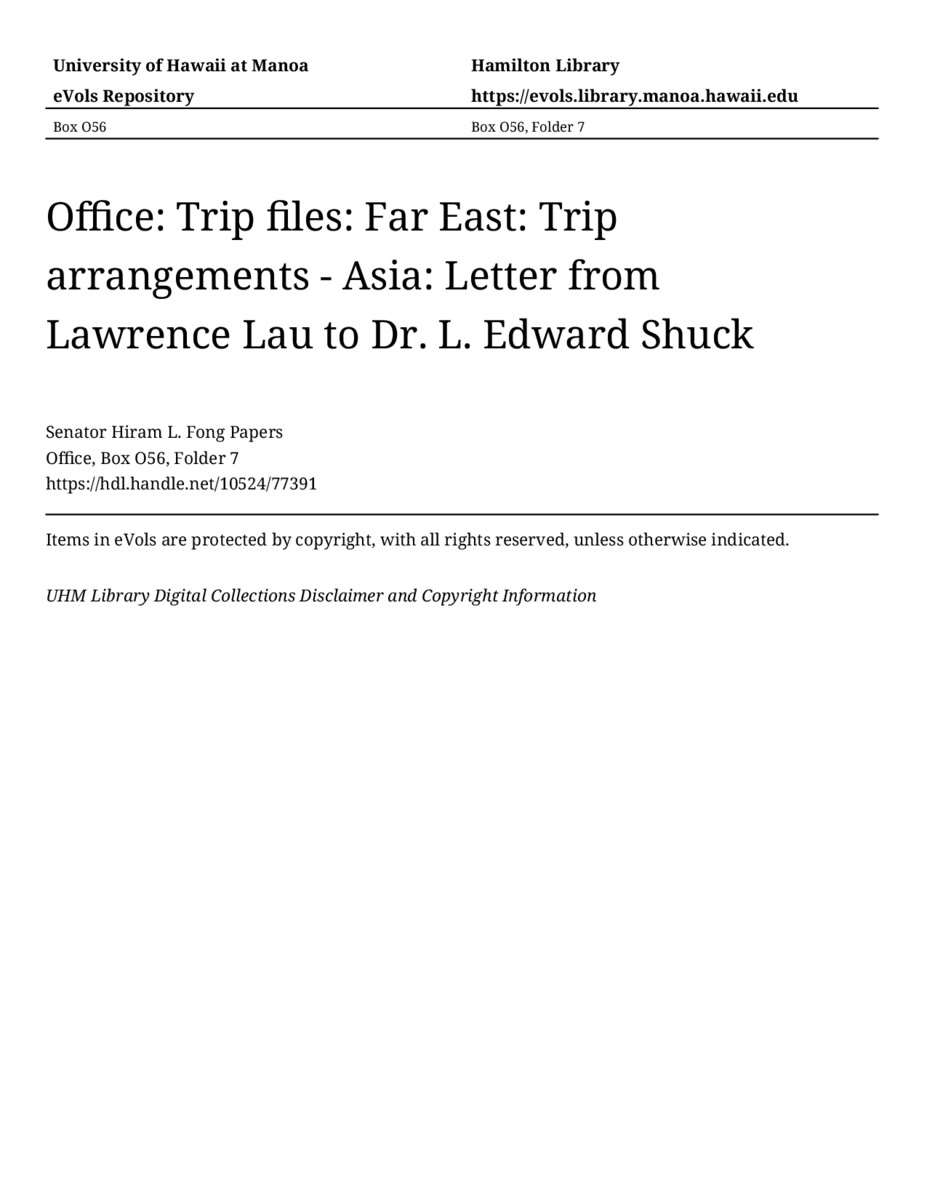 Letter from Lawrence Lau to Dr. L. Edward Shuck, October 12, 1959, MANUSCRIPT-HCPC00003, Office, Box O56, Folder 7, Senator Hiram L. Fong Papers, Hawaiʻi Congressional Papers Collection, University of Hawaiʻi at Mānoa Library, Honolulu, HI. https://congressarchives.org/catalog/10524_77391 (accessed March 18, 2026).