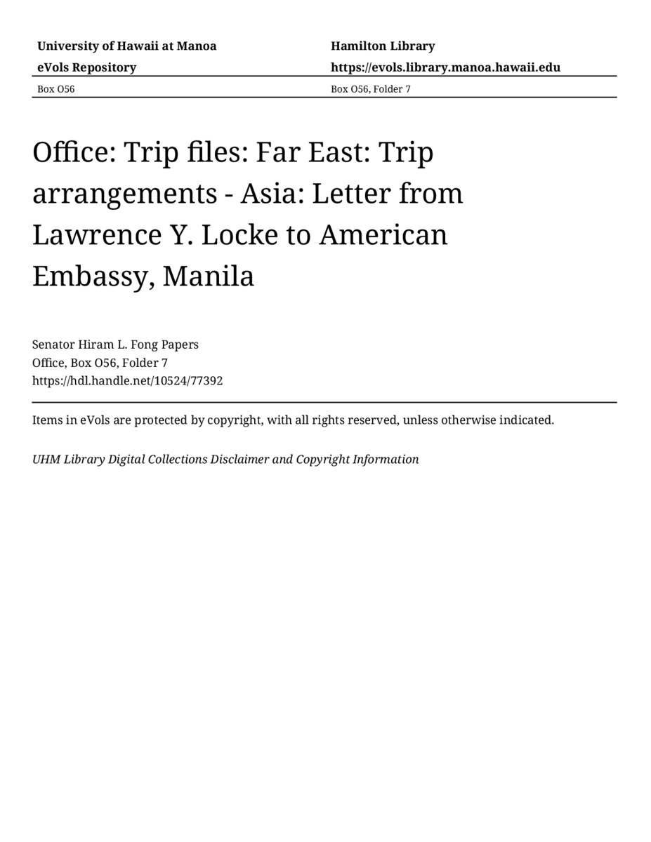 Letter from Lawrence Y. Locke to American Embassy, Manila, 1959, MANUSCRIPT-HCPC00003, Office, Box O56, Folder 7, Senator Hiram L. Fong Papers, Hawaiʻi Congressional Papers Collection, University of Hawaiʻi at Mānoa Library, Honolulu, HI. https://congressarchives.org/catalog/10524_77392 (accessed March 15, 2026).