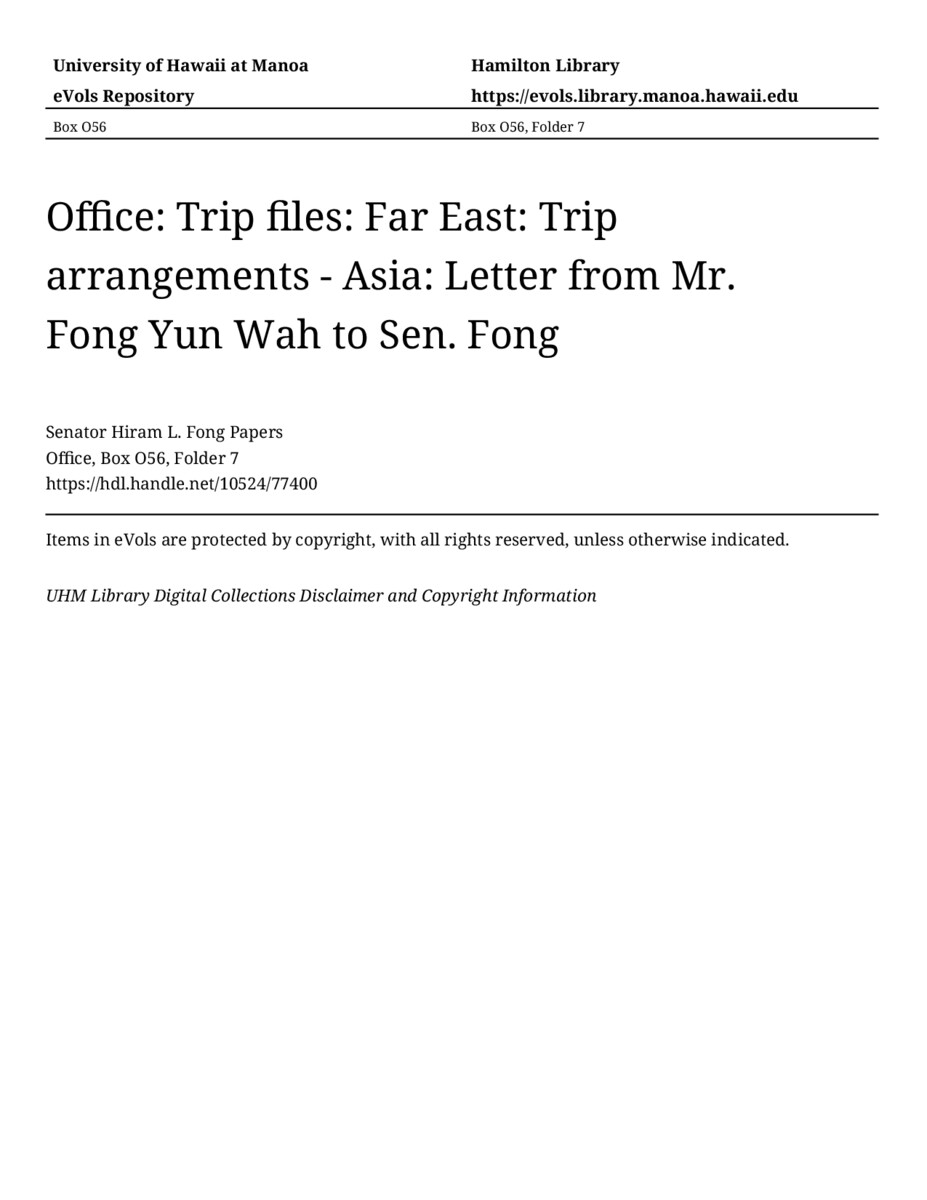 Letter from Mr. Fong Yun Wah to Sen. Fong, September 29, 1959, MANUSCRIPT-HCPC00003, Office, Box O56, Folder 7, Senator Hiram L. Fong Papers, Hawaiʻi Congressional Papers Collection, University of Hawaiʻi at Mānoa Library, Honolulu, HI. https://congressarchives.org/catalog/10524_77400 (accessed March 15, 2026).