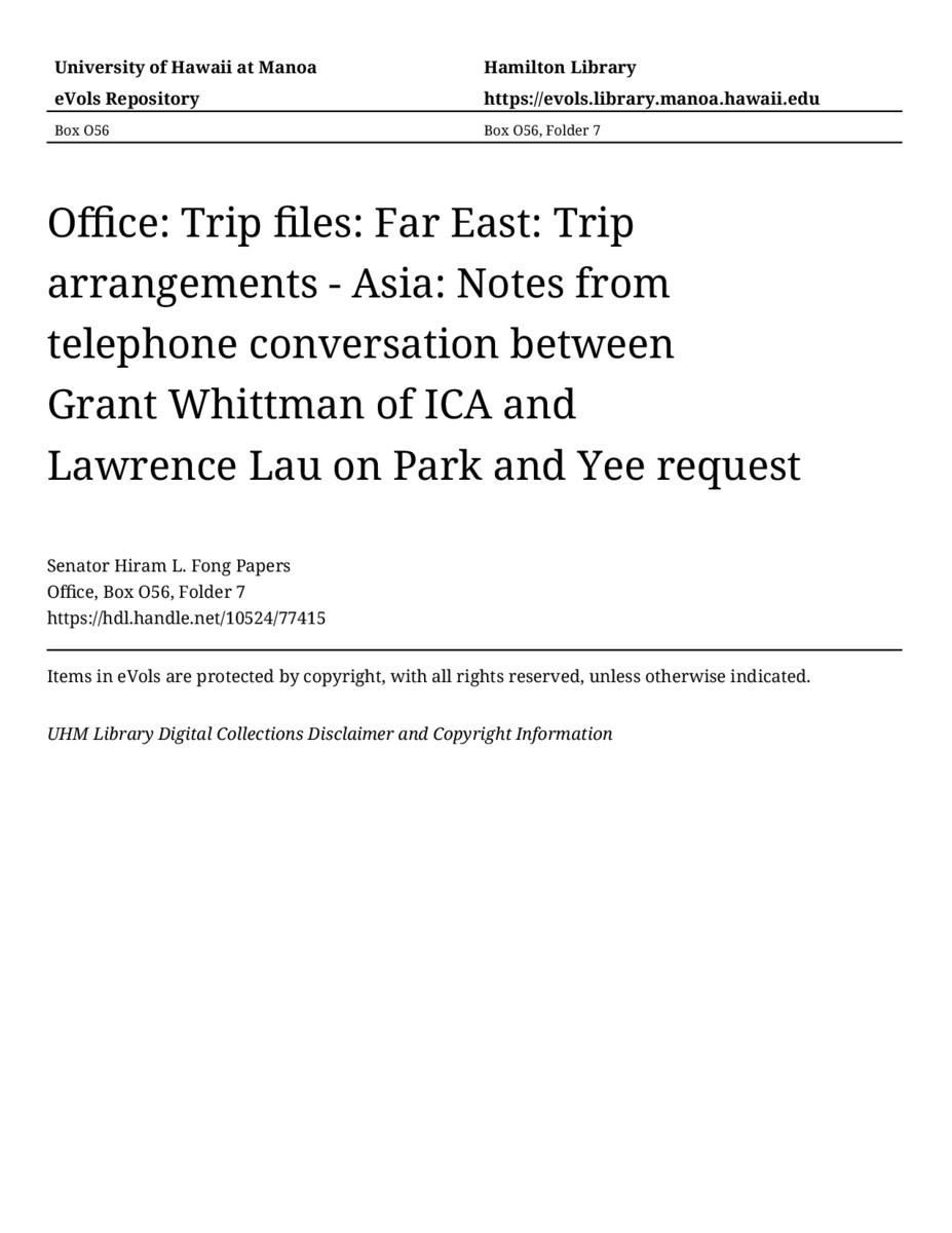 Notes from telephone conversation between Grant Whittman of ICA and Lawrence Lau on Park and Yee request