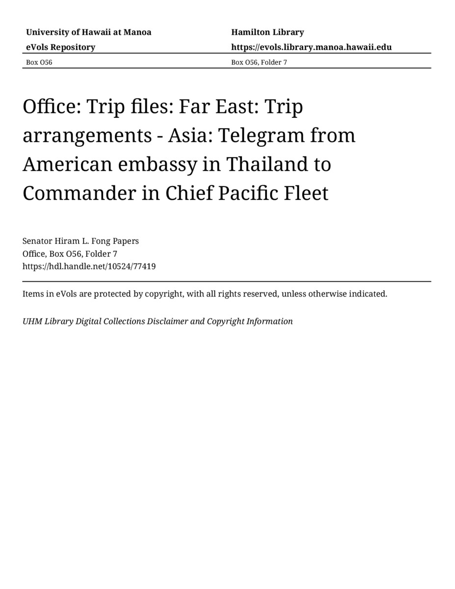 - Telegram from American embassy in Thailand to Commander in Chief Pacific Fleet