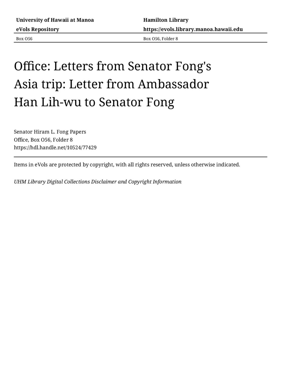 Letter from Ambassador Han Lih-wu to Senator Fong, November 12, 1959, MANUSCRIPT-HCPC00003, Office, Box O56, Folder 8, Senator Hiram L. Fong Papers, Hawaiʻi Congressional Papers Collection, University of Hawaiʻi at Mānoa Library, Honolulu, HI. https://congressarchives.org/catalog/10524_77429 (accessed March 19, 2026).