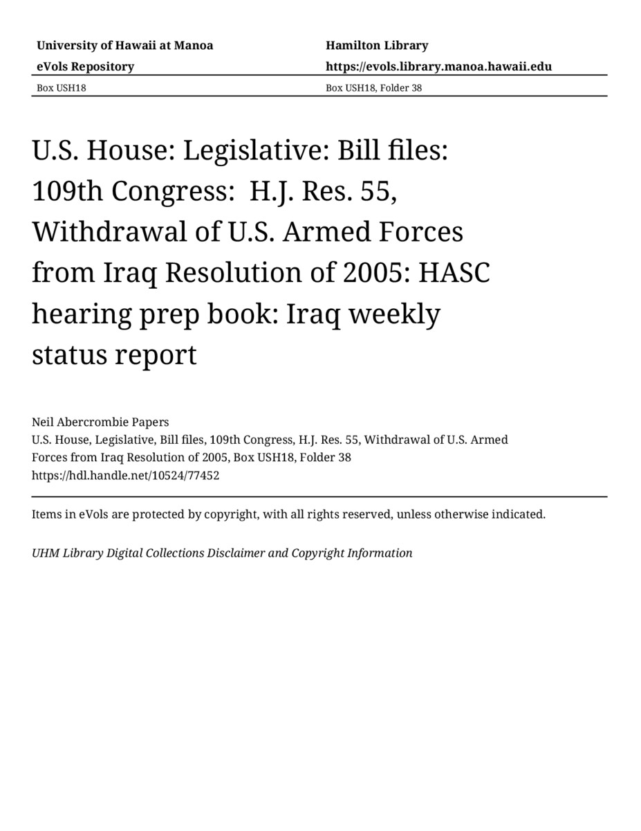 - MANUSCRIPT-HCPC00009, U.S. House, Legislative, Bill files, 109th Congress, H.J. Res. 55, Withdrawal of U.S. Armed Forces from Iraq Resolution of 2005, Box USH18, Folder 38