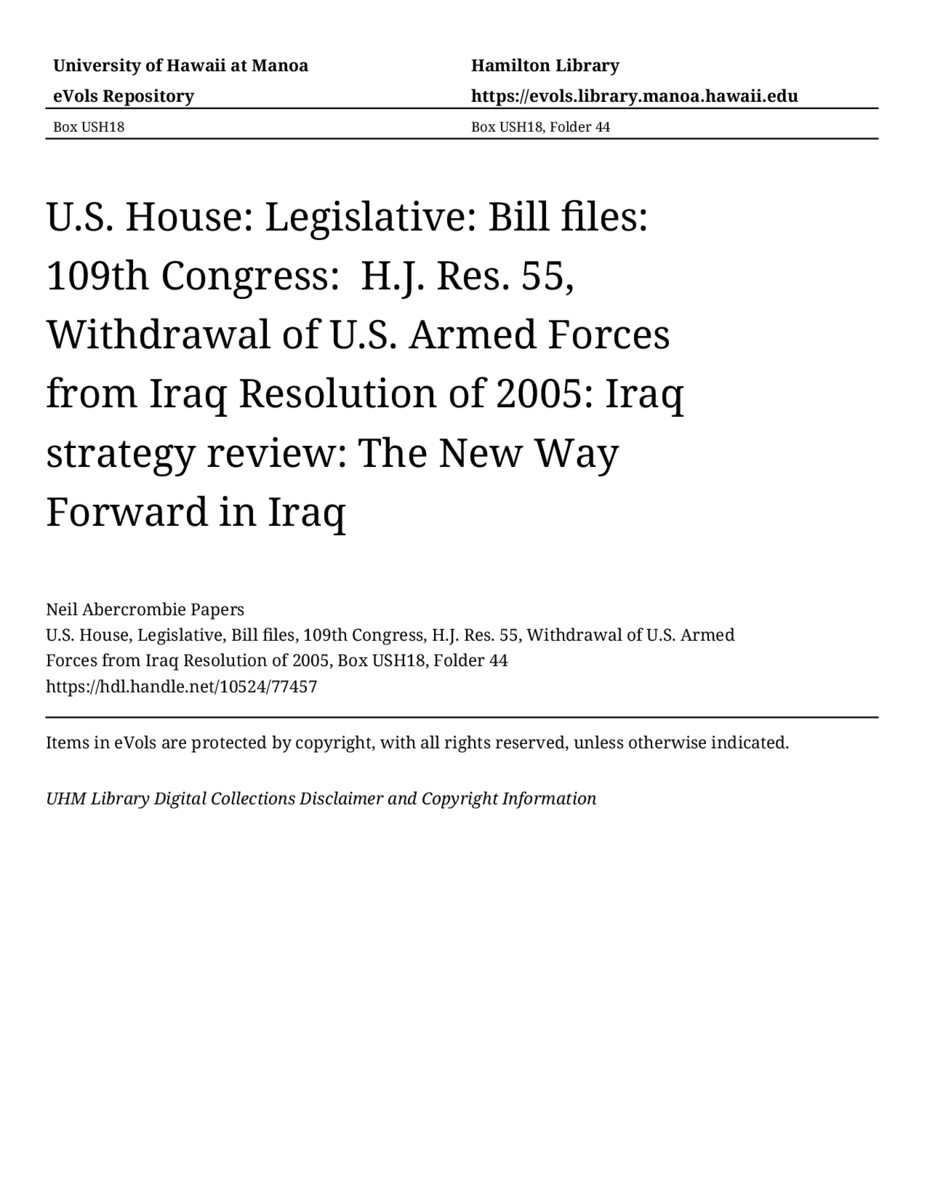 - MANUSCRIPT-HCPC00009, U.S. House, Legislative, Bill files, 109th Congress, H.J. Res. 55, Withdrawal of U.S. Armed Forces from Iraq Resolution of 2005, Box USH18, Folder 44