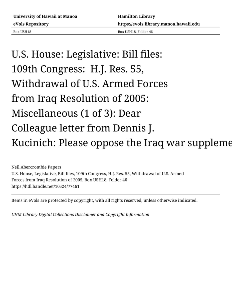 Dear Colleague letter from Dennis J. Kucinich: Please oppose the Iraq war supplemental, 2007, MANUSCRIPT-HCPC00009, U.S. House, Legislative, Bill files, 109th Congress, H.J. Res. 55, Withdrawal of U.S. Armed Forces from Iraq Resolution of 2005, Box USH18, Folder 46, Neil Abercrombie Papers, Hawaiʻi Congressional Papers Collection, University of Hawaiʻi at Mānoa Library, Honolulu, HI. https://congressarchives.org/catalog/10524_77461 (accessed March 17, 2026).