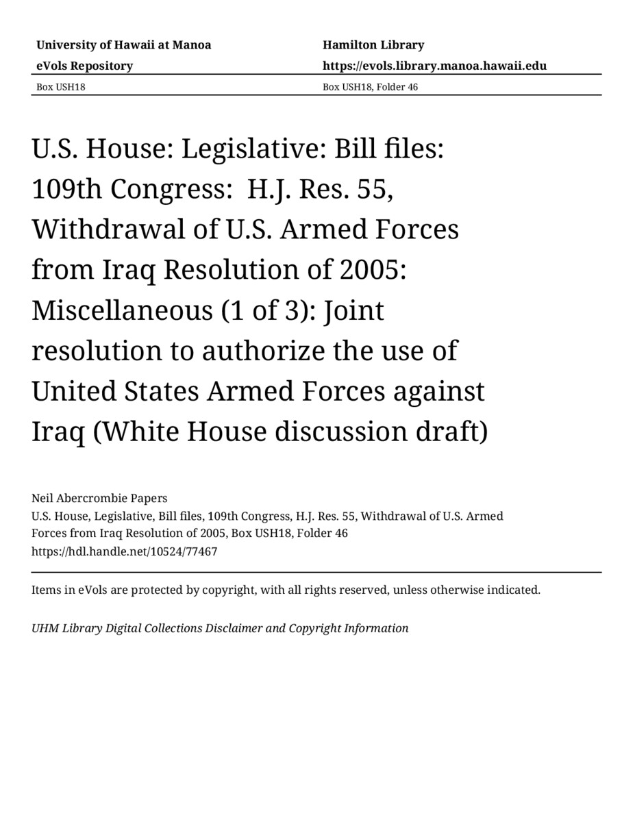 Joint resolution to authorize the use of United States Armed Forces against Iraq (White House discussion draft), September 19, 2002, MANUSCRIPT-HCPC00009, U.S. House, Legislative, Bill files, 109th Congress, H.J. Res. 55, Withdrawal of U.S. Armed Forces from Iraq Resolution of 2005, Box USH18, Folder 46, Neil Abercrombie Papers, Hawaiʻi Congressional Papers Collection, University of Hawaiʻi at Mānoa Library, Honolulu, HI. https://congressarchives.org/catalog/10524_77467 (accessed March 18, 2026).
