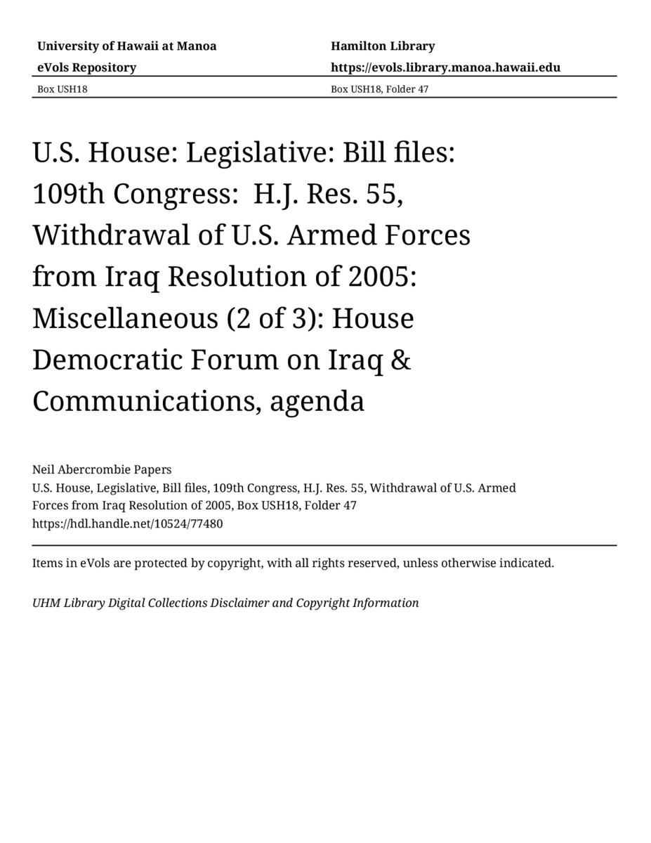 House Democratic Forum on Iraq & Communications, agenda, December 5, 2006, MANUSCRIPT-HCPC00009, U.S. House, Legislative, Bill files, 109th Congress, H.J. Res. 55, Withdrawal of U.S. Armed Forces from Iraq Resolution of 2005, Box USH18, Folder 47, Neil Abercrombie Papers, Hawaiʻi Congressional Papers Collection, University of Hawaiʻi at Mānoa Library, Honolulu, HI. https://congressarchives.org/catalog/10524_77480 (accessed March 18, 2026).