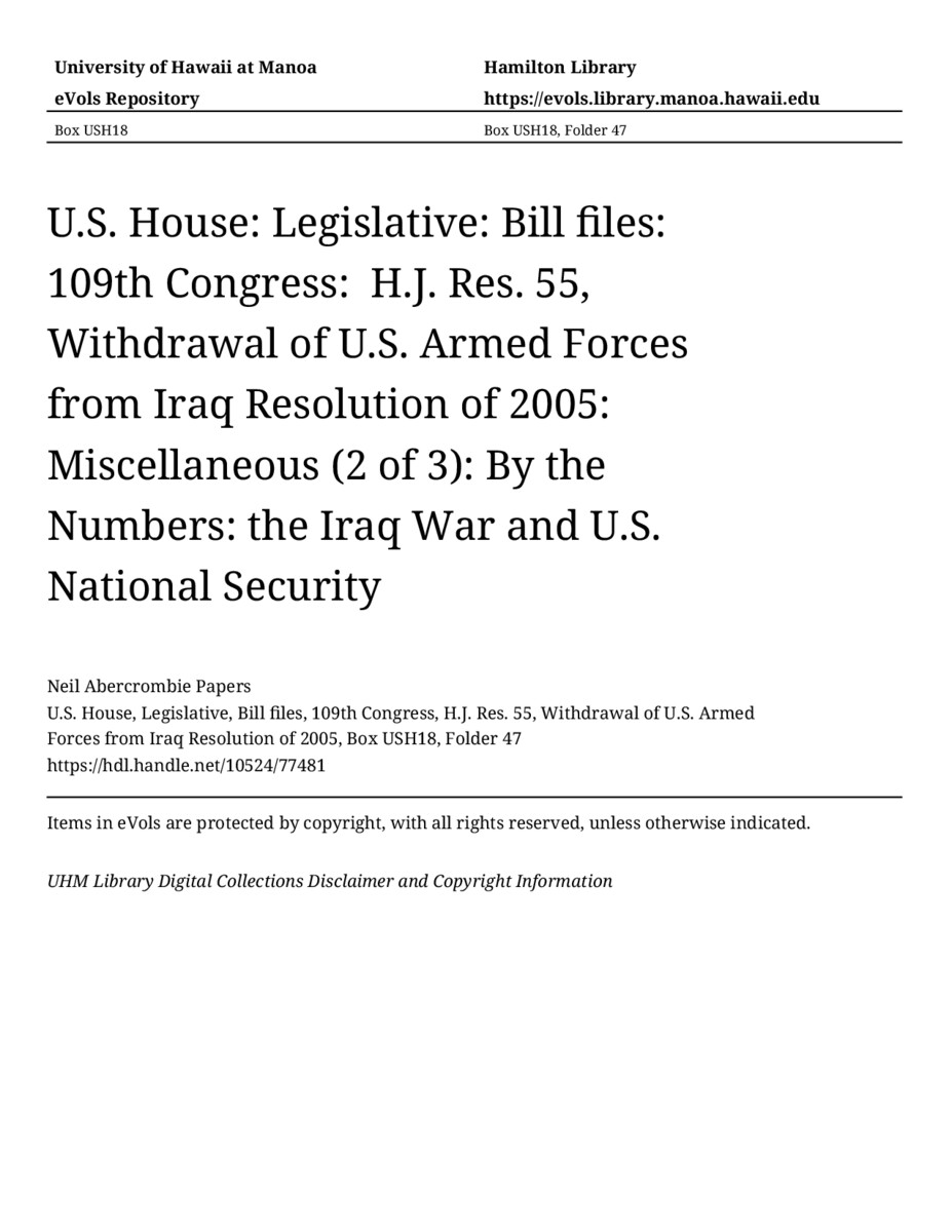 By the Numbers: the Iraq War and U.S. National Security, June 28, 1905, MANUSCRIPT-HCPC00009, U.S. House, Legislative, Bill files, 109th Congress, H.J. Res. 55, Withdrawal of U.S. Armed Forces from Iraq Resolution of 2005, Box USH18, Folder 47, Neil Abercrombie Papers, Hawaiʻi Congressional Papers Collection, University of Hawaiʻi at Mānoa Library, Honolulu, HI. https://congressarchives.org/catalog/10524_77481 (accessed March 18, 2026).
