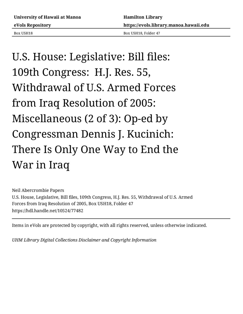 Op-ed by Congressman Dennis J. Kucinich: There Is Only One Way to End the War in Iraq, June 28, 1905, MANUSCRIPT-HCPC00009, U.S. House, Legislative, Bill files, 109th Congress, H.J. Res. 55, Withdrawal of U.S. Armed Forces from Iraq Resolution of 2005, Box USH18, Folder 47, Neil Abercrombie Papers, Hawaiʻi Congressional Papers Collection, University of Hawaiʻi at Mānoa Library, Honolulu, HI. https://congressarchives.org/catalog/10524_77482 (accessed March 17, 2026).