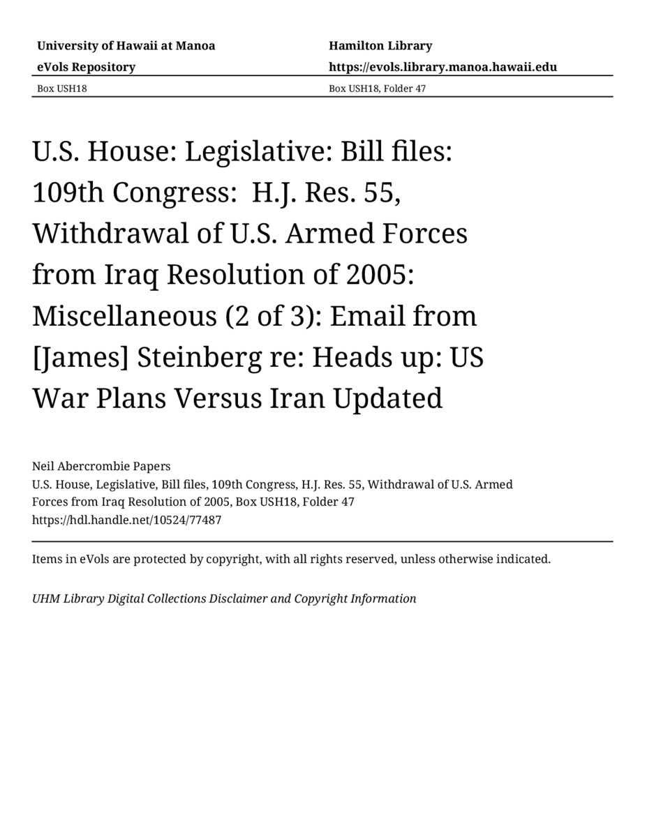Email from [James] Steinberg re: Heads up: US War Plans Versus Iran Updated, January 15, 2007, MANUSCRIPT-HCPC00009, U.S. House, Legislative, Bill files, 109th Congress, H.J. Res. 55, Withdrawal of U.S. Armed Forces from Iraq Resolution of 2005, Box USH18, Folder 47, Neil Abercrombie Papers, Hawaiʻi Congressional Papers Collection, University of Hawaiʻi at Mānoa Library, Honolulu, HI. https://congressarchives.org/catalog/10524_77487 (accessed March 19, 2026).