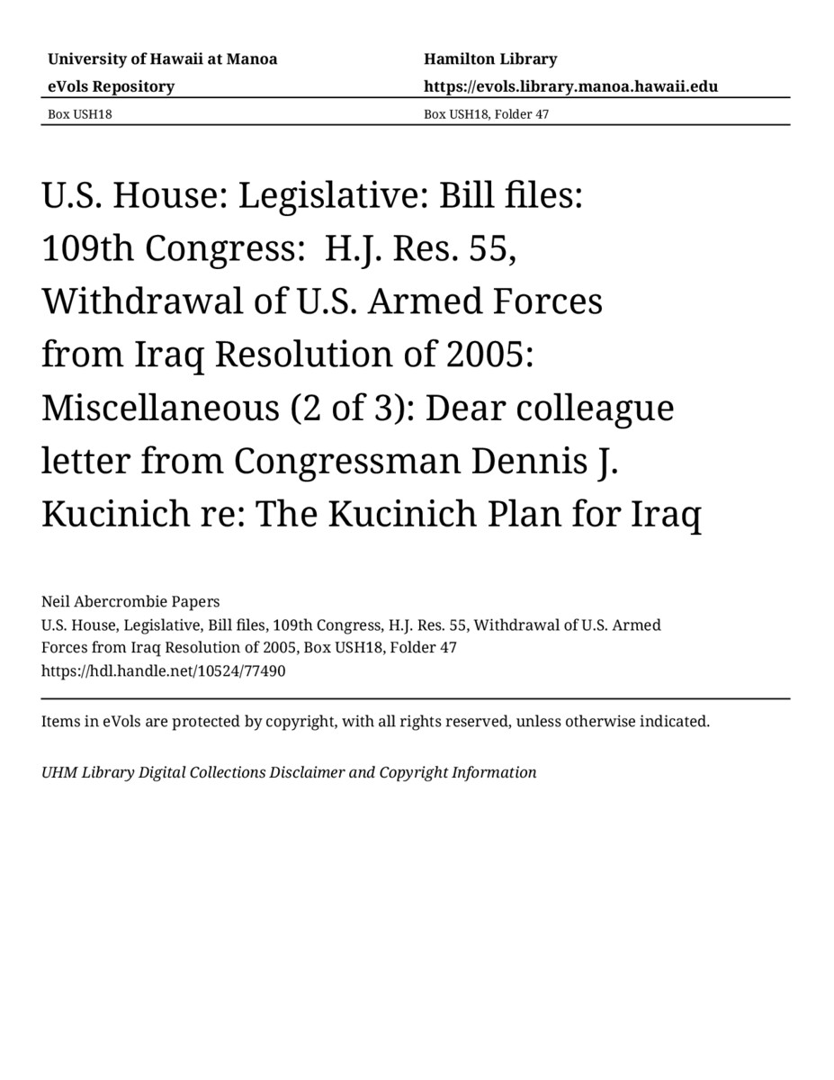 Dear colleague letter from Congressman Dennis J. Kucinich re: The Kucinich Plan for Iraq, January 10, 2007, MANUSCRIPT-HCPC00009, U.S. House, Legislative, Bill files, 109th Congress, H.J. Res. 55, Withdrawal of U.S. Armed Forces from Iraq Resolution of 2005, Box USH18, Folder 47, Neil Abercrombie Papers, Hawaiʻi Congressional Papers Collection, University of Hawaiʻi at Mānoa Library, Honolulu, HI. https://congressarchives.org/catalog/10524_77490 (accessed March 17, 2026).