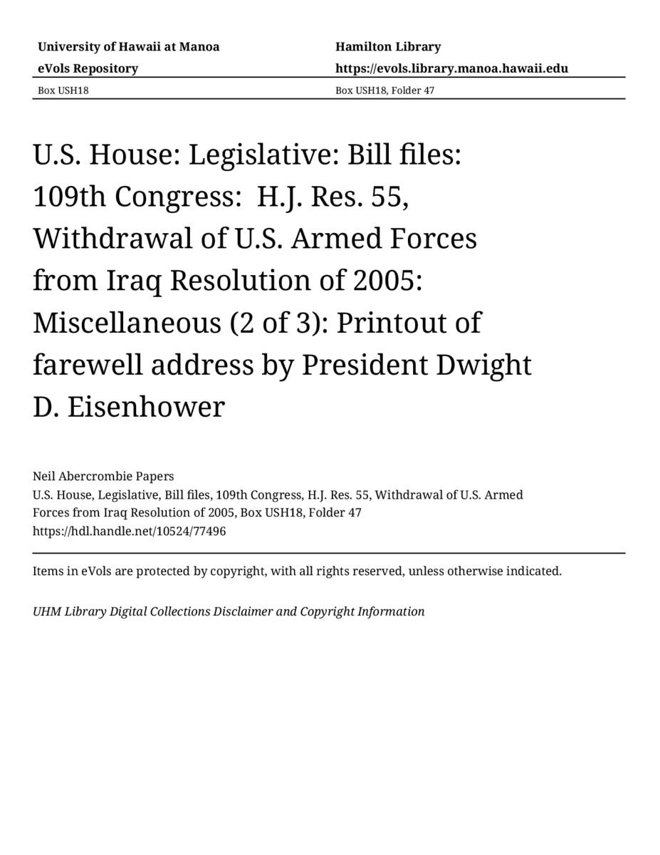 Printout of farewell address by President Dwight D. Eisenhower, May 23, 2007, MANUSCRIPT-HCPC00009, U.S. House, Legislative, Bill files, 109th Congress, H.J. Res. 55, Withdrawal of U.S. Armed Forces from Iraq Resolution of 2005, Box USH18, Folder 47, Neil Abercrombie Papers, Hawaiʻi Congressional Papers Collection, University of Hawaiʻi at Mānoa Library, Honolulu, HI. https://congressarchives.org/catalog/10524_77496 (accessed March 19, 2026).