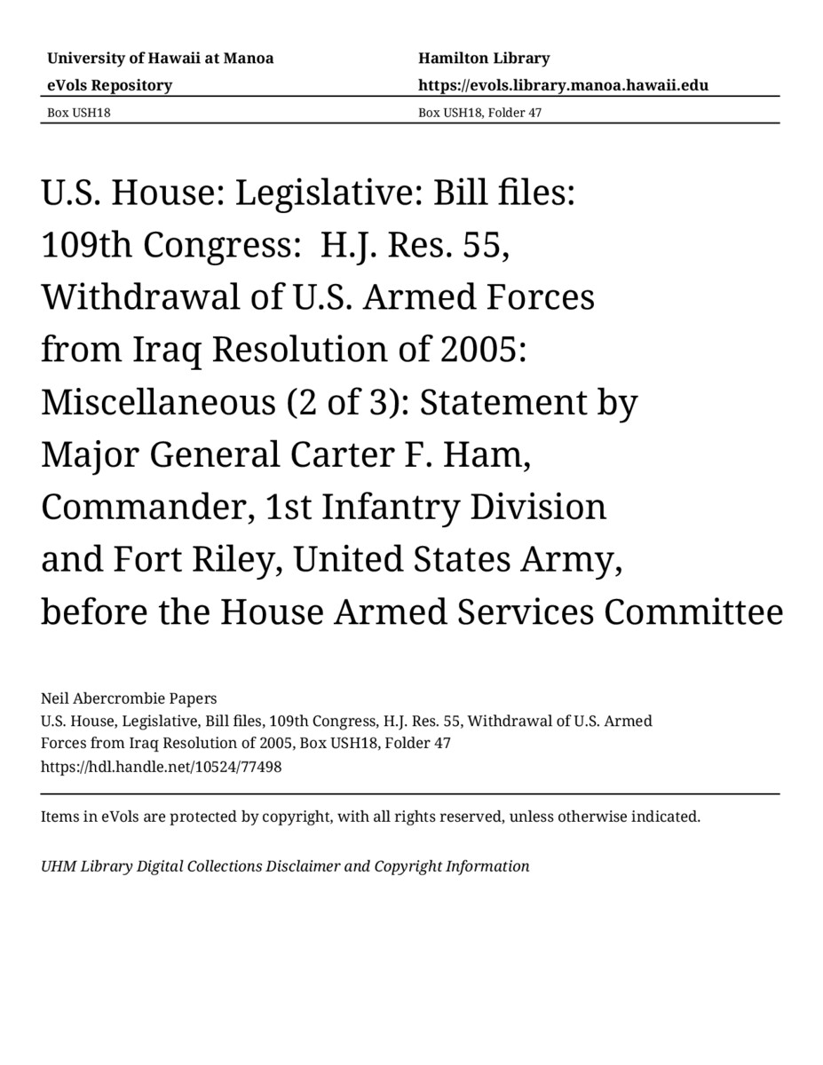 Statement by Major General Carter F. Ham, Commander, 1st Infantry Division and Fort Riley, United States Army, before the House Armed Services Committee, December 7, 2006, MANUSCRIPT-HCPC00009, U.S. House, Legislative, Bill files, 109th Congress, H.J. Res. 55, Withdrawal of U.S. Armed Forces from Iraq Resolution of 2005, Box USH18, Folder 47, Neil Abercrombie Papers, Hawaiʻi Congressional Papers Collection, University of Hawaiʻi at Mānoa Library, Honolulu, HI. https://congressarchives.org/catalog/10524_77498 (accessed March 20, 2026).