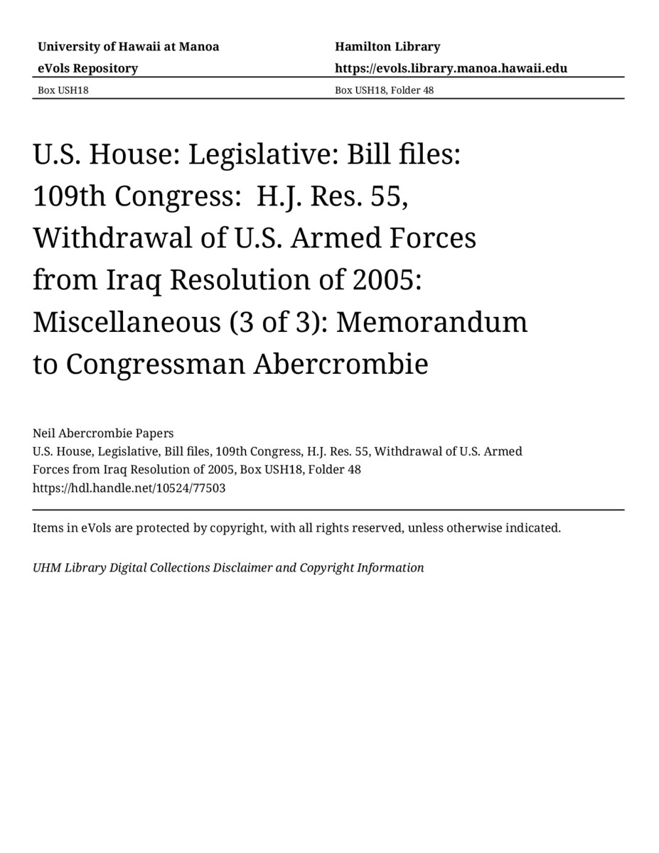 Memorandum to Congressman Abercrombie, approximately 2005-2006, MANUSCRIPT-HCPC00009, U.S. House, Legislative, Bill files, 109th Congress, H.J. Res. 55, Withdrawal of U.S. Armed Forces from Iraq Resolution of 2005, Box USH18, Folder 48, Neil Abercrombie Papers, Hawaiʻi Congressional Papers Collection, University of Hawaiʻi at Mānoa Library, Honolulu, HI. https://congressarchives.org/catalog/10524_77503 (accessed March 18, 2026).