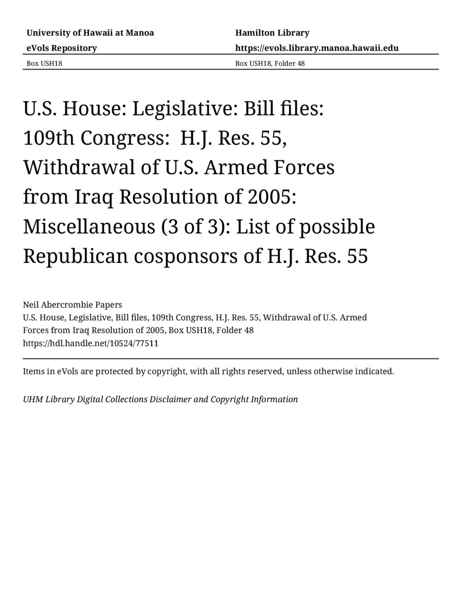 List of possible Republican cosponsors of H.J. Res. 55, July 13, 2005, MANUSCRIPT-HCPC00009, U.S. House, Legislative, Bill files, 109th Congress, H.J. Res. 55, Withdrawal of U.S. Armed Forces from Iraq Resolution of 2005, Box USH18, Folder 48, Neil Abercrombie Papers, Hawaiʻi Congressional Papers Collection, University of Hawaiʻi at Mānoa Library, Honolulu, HI. https://congressarchives.org/catalog/10524_77511 (accessed March 18, 2026).
