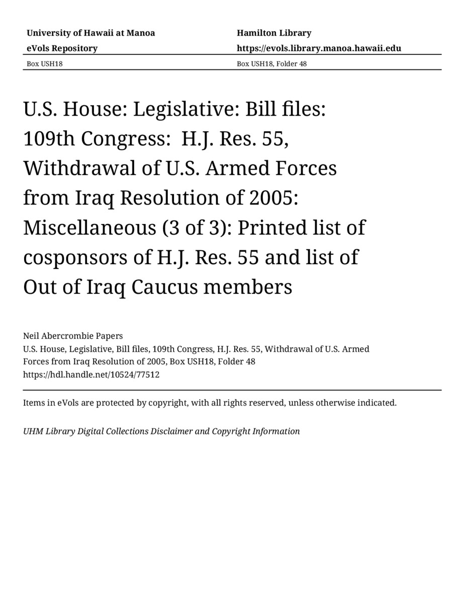 Printed list of cosponsors of H.J. Res. 55 and list of Out of Iraq Caucus members, July 20, 2005, MANUSCRIPT-HCPC00009, U.S. House, Legislative, Bill files, 109th Congress, H.J. Res. 55, Withdrawal of U.S. Armed Forces from Iraq Resolution of 2005, Box USH18, Folder 48, Neil Abercrombie Papers, Hawaiʻi Congressional Papers Collection, University of Hawaiʻi at Mānoa Library, Honolulu, HI. https://congressarchives.org/catalog/10524_77512 (accessed March 17, 2026).