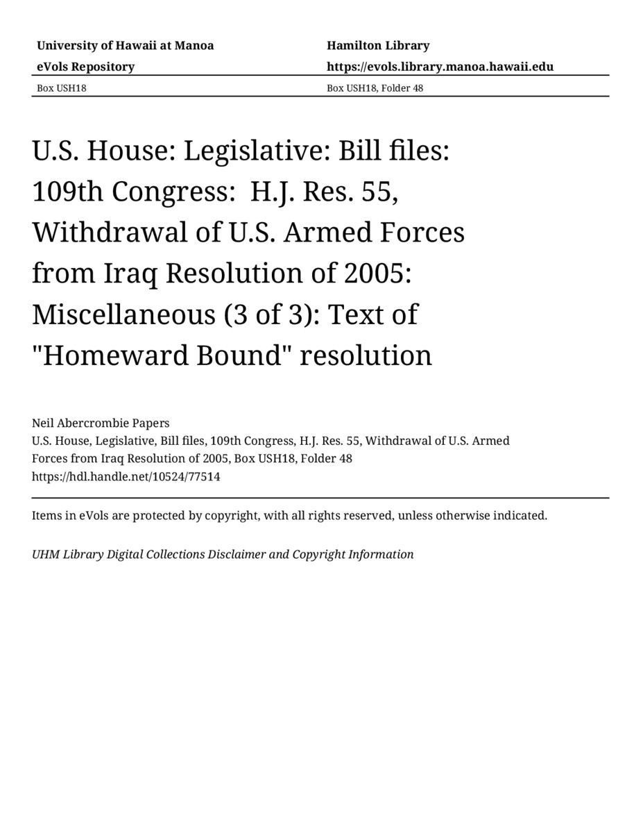 Text of "Homeward Bound" resolution, June 15, 2005, MANUSCRIPT-HCPC00009, U.S. House, Legislative, Bill files, 109th Congress, H.J. Res. 55, Withdrawal of U.S. Armed Forces from Iraq Resolution of 2005, Box USH18, Folder 48, Neil Abercrombie Papers, Hawaiʻi Congressional Papers Collection, University of Hawaiʻi at Mānoa Library, Honolulu, HI. https://congressarchives.org/catalog/10524_77514 (accessed March 20, 2026).