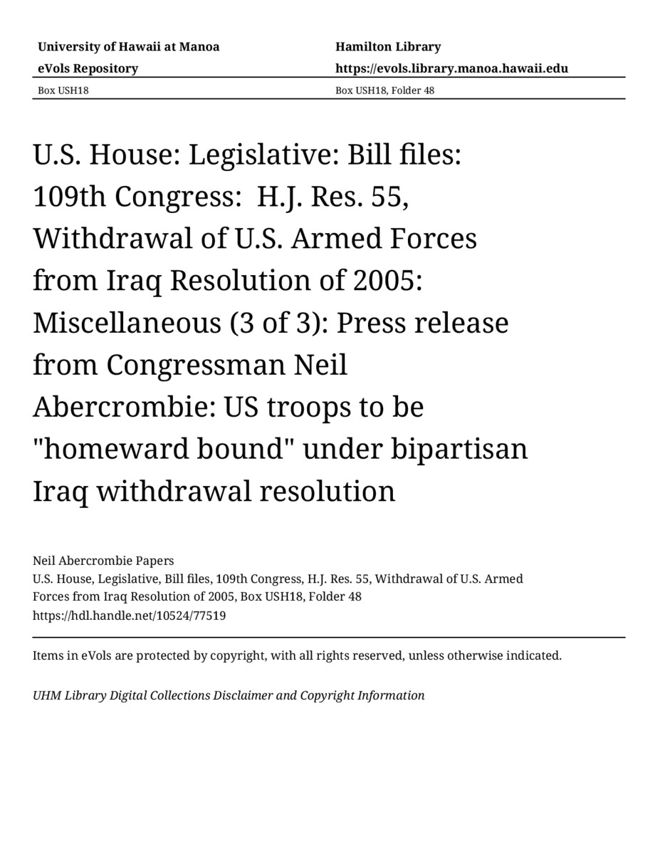 Press release from Congressman Neil Abercrombie: US troops to be "homeward bound" under bipartisan Iraq withdrawal resolution, June 16, 2005, MANUSCRIPT-HCPC00009, U.S. House, Legislative, Bill files, 109th Congress, H.J. Res. 55, Withdrawal of U.S. Armed Forces from Iraq Resolution of 2005, Box USH18, Folder 48, Neil Abercrombie Papers, Hawaiʻi Congressional Papers Collection, University of Hawaiʻi at Mānoa Library, Honolulu, HI. https://congressarchives.org/catalog/10524_77519 (accessed March 17, 2026).