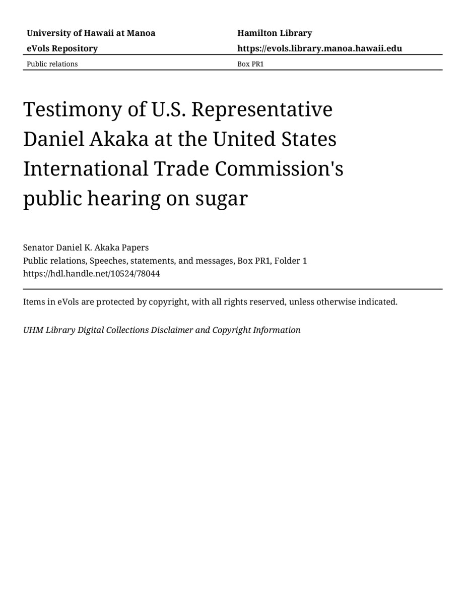 Testimony of U.S. Representative Daniel Akaka at the United States International Trade Commission's public hearing on sugar, November 30, 1976, MANUSCRIPT-HCPC00010, Public relations, Speeches, statements, and messages, Box PR1, Folder 1, Senator Daniel K. Akaka Papers, Hawaiʻi Congressional Papers Collection, University of Hawaiʻi at Mānoa Library, Honolulu, HI. https://congressarchives.org/catalog/10524_78044 (accessed March 18, 2026).
