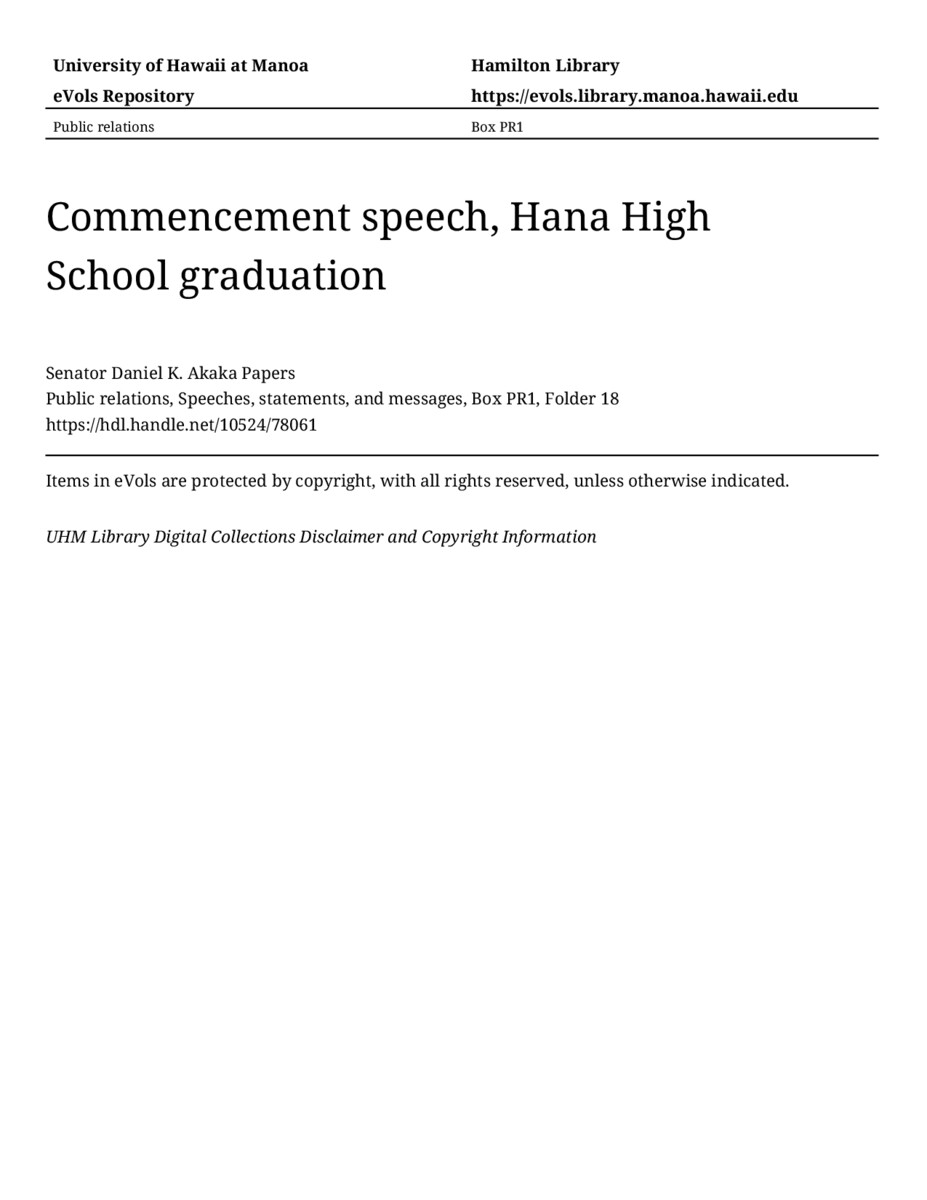 Commencement speech, Hana High School graduation, June 4, 1977, MANUSCRIPT-HCPC00010, Public relations, Speeches, statements, and messages, Box PR1, Folder 18, Senator Daniel K. Akaka Papers, Hawaiʻi Congressional Papers Collection, University of Hawaiʻi at Mānoa Library, Honolulu, HI. https://congressarchives.org/catalog/10524_78061 (accessed March 18, 2026).