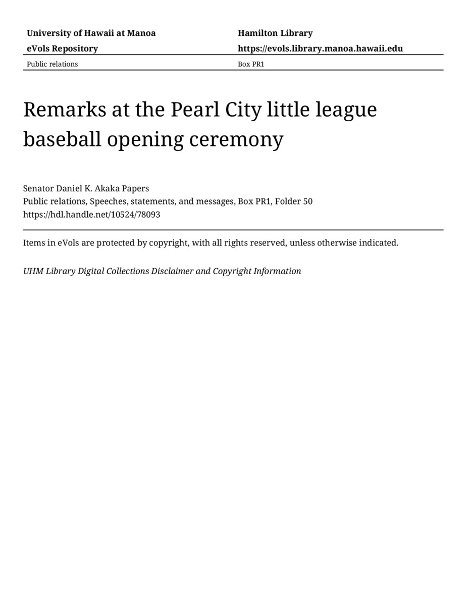 - Remarks at the Pearl City little league baseball opening ceremony