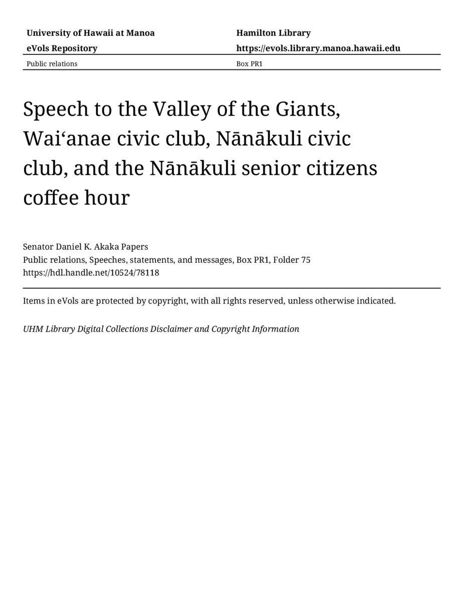 Speech to the Valley of the Giants, Waiʻanae civic club, Nānākuli civic club, and the Nānākuli senior citizens coffee hour, October 26, 1978, MANUSCRIPT-HCPC00010, Public relations, Speeches, statements, and messages, Box PR1, Folder 75, Senator Daniel K. Akaka Papers, Hawaiʻi Congressional Papers Collection, University of Hawaiʻi at Mānoa Library, Honolulu, HI. https://congressarchives.org/catalog/10524_78118 (accessed March 20, 2026).