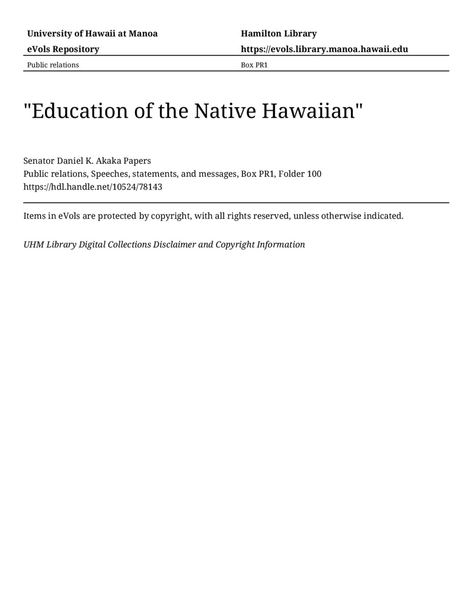 "Education of the Native Hawaiian", May 8, 1979, MANUSCRIPT-HCPC00010, Public relations, Speeches, statements, and messages, Box PR1, Folder 100, Senator Daniel K. Akaka Papers, Hawaiʻi Congressional Papers Collection, University of Hawaiʻi at Mānoa Library, Honolulu, HI. https://congressarchives.org/catalog/10524_78143 (accessed March 18, 2026).