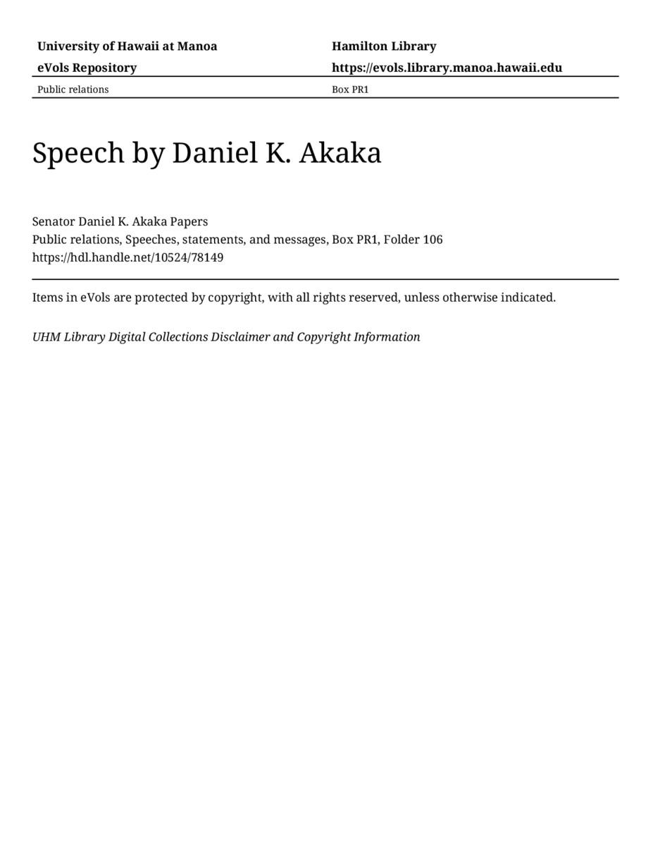 Speech by Daniel K. Akaka, June 7, 1979, MANUSCRIPT-HCPC00010, Public relations, Speeches, statements, and messages, Box PR1, Folder 106, Senator Daniel K. Akaka Papers, Hawaiʻi Congressional Papers Collection, University of Hawaiʻi at Mānoa Library, Honolulu, HI. https://congressarchives.org/catalog/10524_78149 (accessed March 20, 2026).