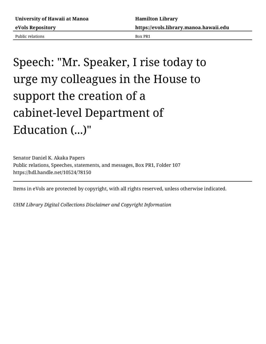 Speech: "Mr. Speaker, I rise today to urge my colleagues in the House to support the creation of a cabinet-level Department of Education (...)", June 7, 1979, MANUSCRIPT-HCPC00010, Public relations, Speeches, statements, and messages, Box PR1, Folder 107, Senator Daniel K. Akaka Papers, Hawaiʻi Congressional Papers Collection, University of Hawaiʻi at Mānoa Library, Honolulu, HI. https://congressarchives.org/catalog/10524_78150 (accessed March 18, 2026).