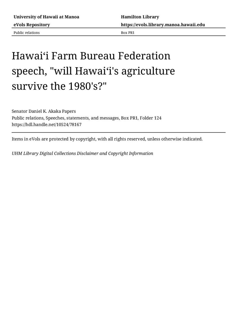 Hawaiʻi Farm Bureau Federation speech, "will Hawaiʻi's agriculture survive the 1980's?"