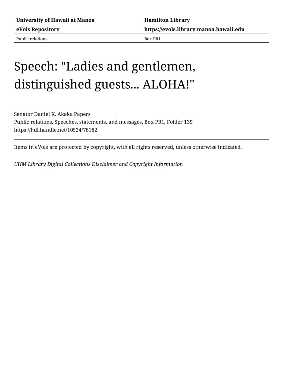 Speech: "Ladies and gentlemen, distinguished guests... ALOHA!", approximately 1979-1980, MANUSCRIPT-HCPC00010, Public relations, Speeches, statements, and messages, Box PR1, Folder 139, Senator Daniel K. Akaka Papers, Hawaiʻi Congressional Papers Collection, University of Hawaiʻi at Mānoa Library, Honolulu, HI. https://congressarchives.org/catalog/10524_78182 (accessed March 19, 2026).