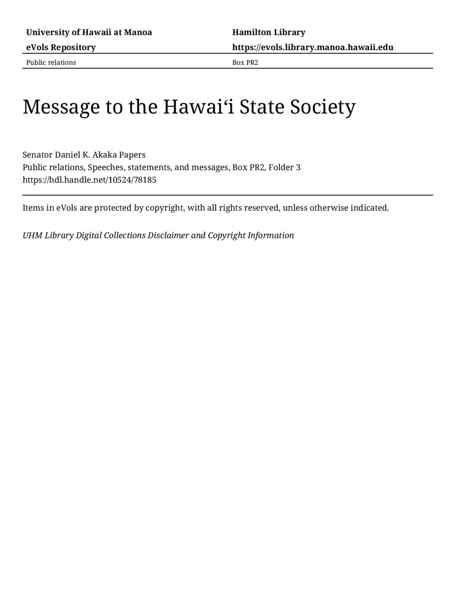 Message to the Hawaiʻi State Society, January 25, 1980, MANUSCRIPT-HCPC00010, Public relations, Speeches, statements, and messages, Box PR2, Folder 3, Senator Daniel K. Akaka Papers, Hawaiʻi Congressional Papers Collection, University of Hawaiʻi at Mānoa Library, Honolulu, HI. https://congressarchives.org/catalog/10524_78185 (accessed March 19, 2026).