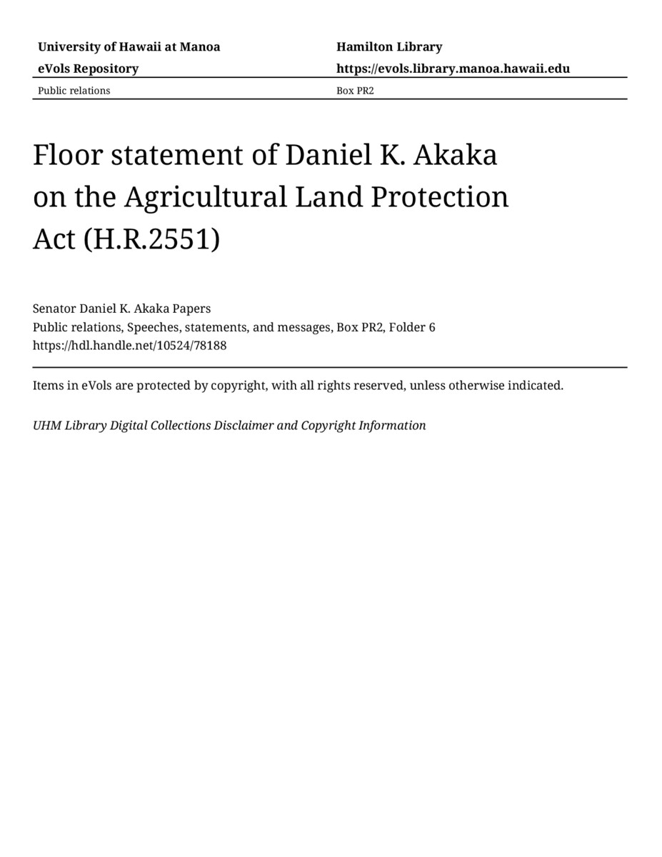 - Floor statement of Daniel K. Akaka on the Agricultural Land Protection Act (H.R.2551)