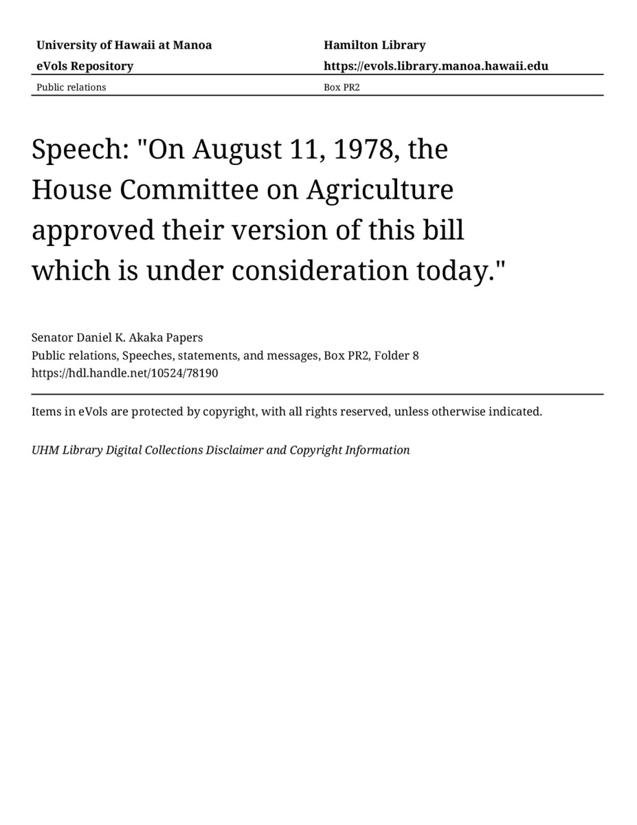 Speech: "On August 11, 1978, the House Committee on Agriculture approved their version of this bill which is under consideration today.", March 11, 1980, MANUSCRIPT-HCPC00010, Public relations, Speeches, statements, and messages, Box PR2, Folder 8, Senator Daniel K. Akaka Papers, Hawaiʻi Congressional Papers Collection, University of Hawaiʻi at Mānoa Library, Honolulu, HI. https://congressarchives.org/catalog/10524_78190 (accessed March 20, 2026).