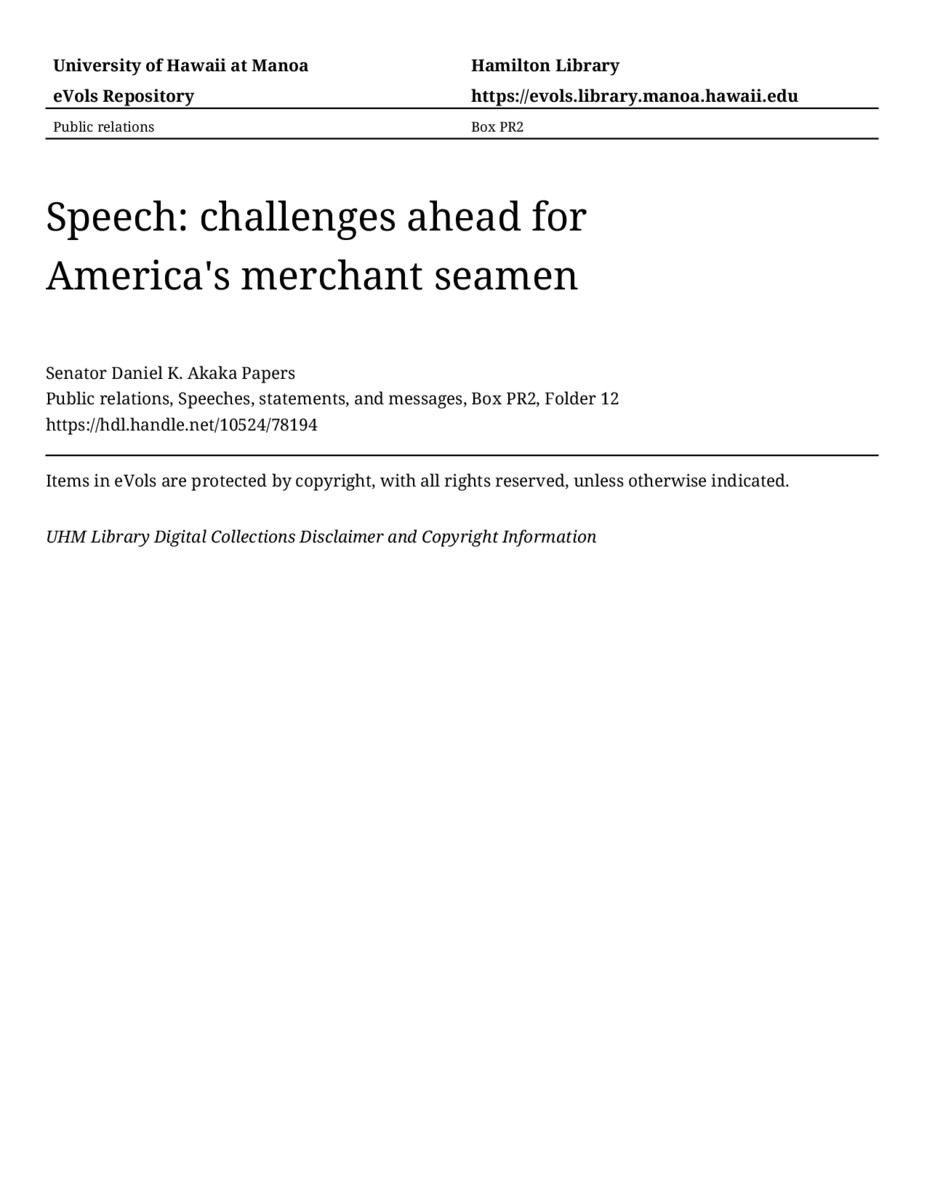 Speech: challenges ahead for America's merchant seamen, May 12, 1980, MANUSCRIPT-HCPC00010, Public relations, Speeches, statements, and messages, Box PR2, Folder 12, Senator Daniel K. Akaka Papers, Hawaiʻi Congressional Papers Collection, University of Hawaiʻi at Mānoa Library, Honolulu, HI. https://congressarchives.org/catalog/10524_78194 (accessed March 17, 2026).