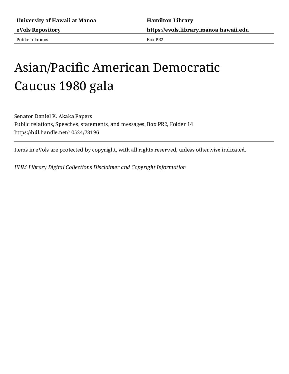 Asian/Pacific American Democratic Caucus 1980 gala, May 22, 1980, MANUSCRIPT-HCPC00010, Public relations, Speeches, statements, and messages, Box PR2, Folder 14, Senator Daniel K. Akaka Papers, Hawaiʻi Congressional Papers Collection, University of Hawaiʻi at Mānoa Library, Honolulu, HI. https://congressarchives.org/catalog/10524_78196 (accessed March 20, 2026).